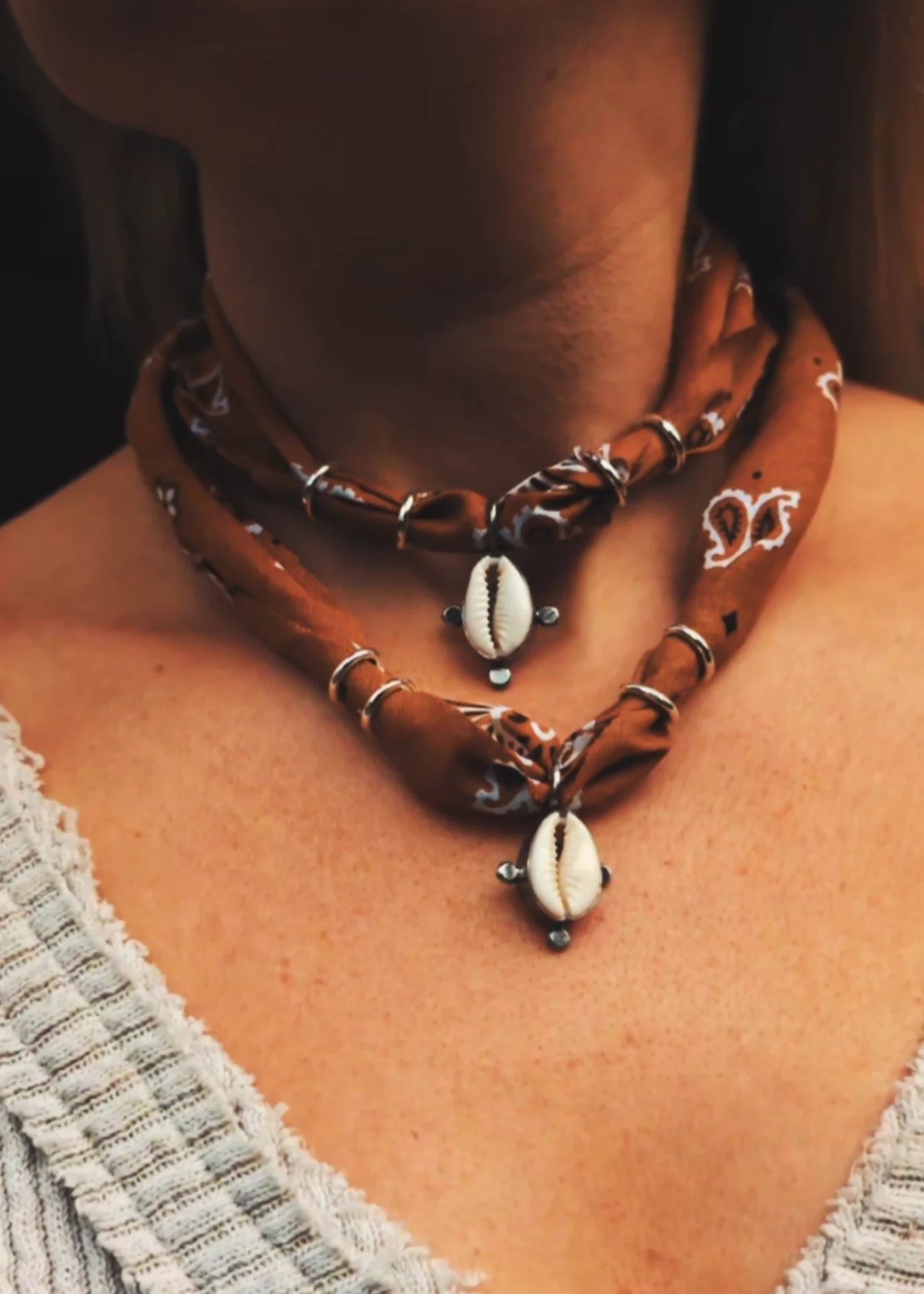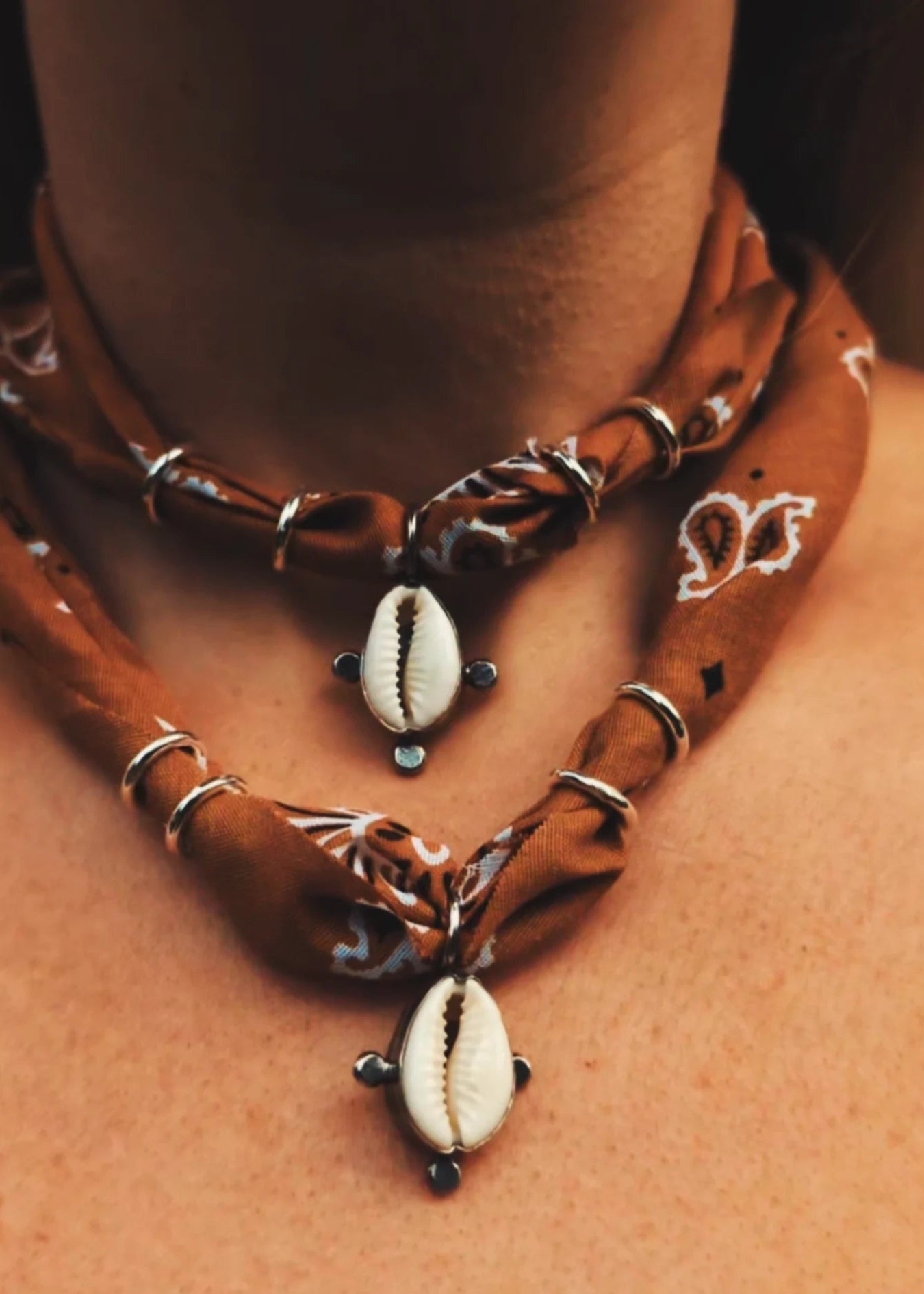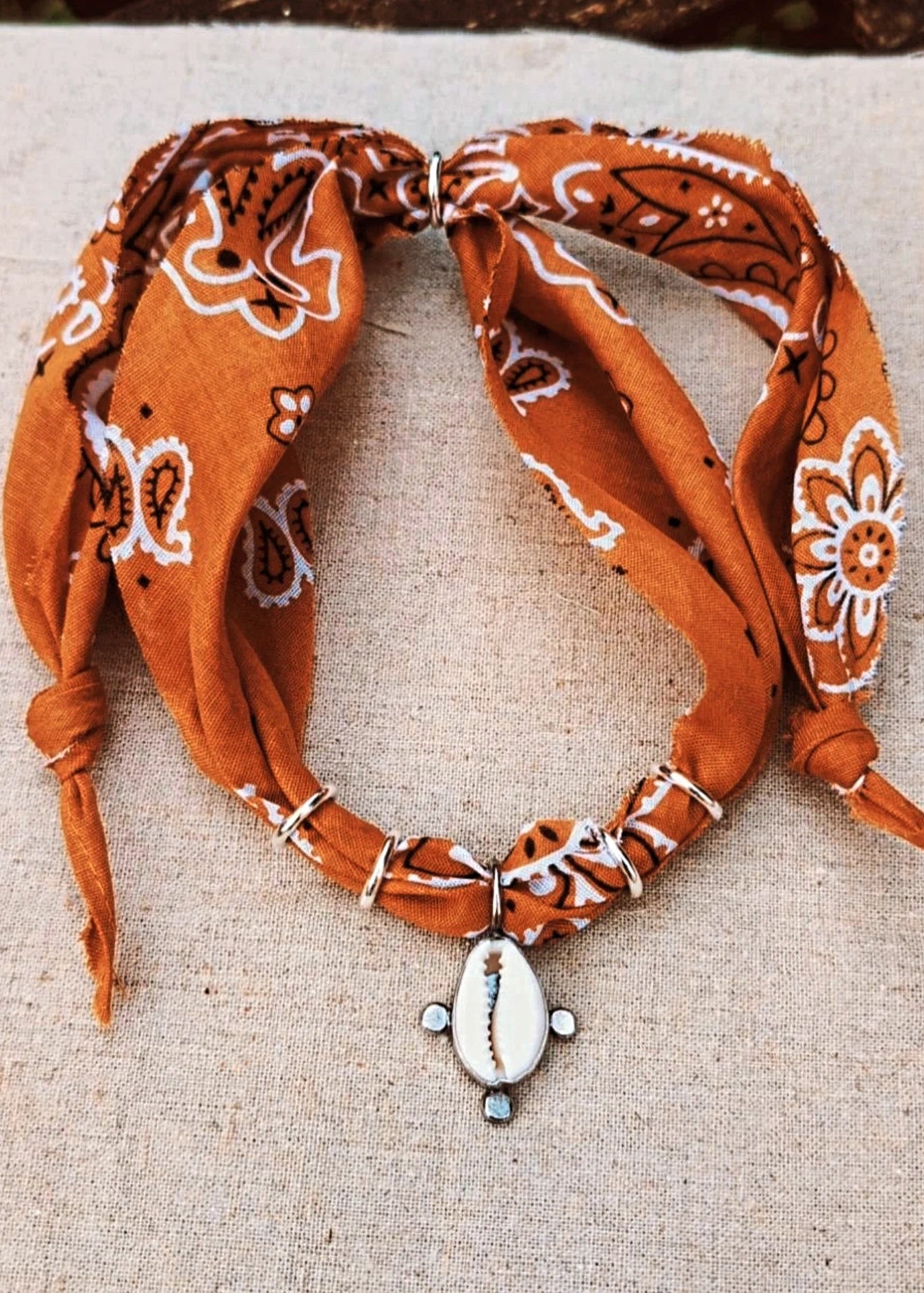 ~Introducing the Beach Bum Bandana...repurposed tobacco cotton bandana, adorned with a dreamy cowrie shell wrapped in silver, finished with handmade recycled sterling silver beads and fastening...one for the beach babes...