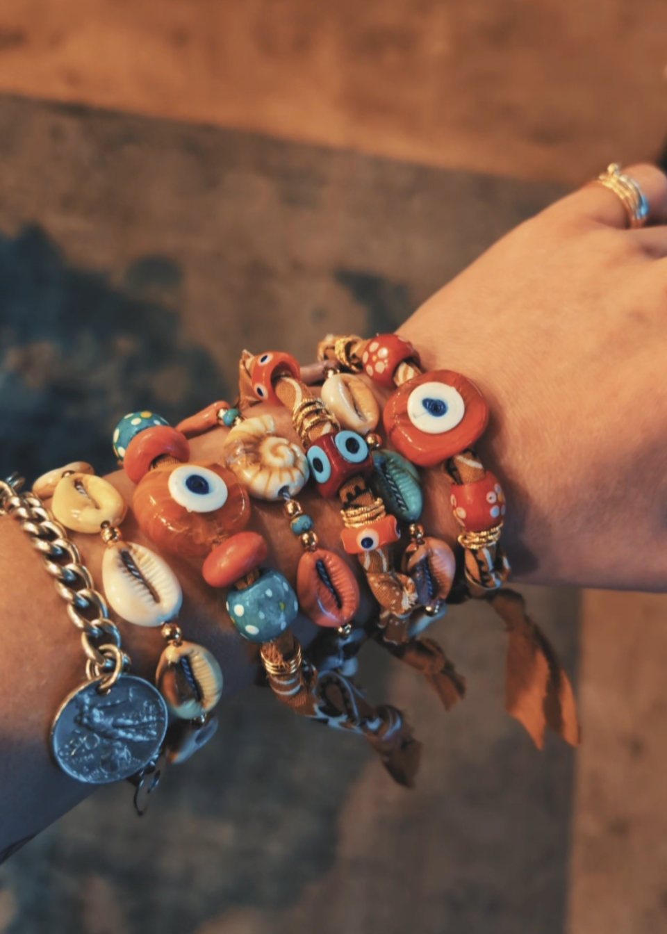 ~For the boho dreamers...create your own 'wrist-mess' with our handmade beaded and bandana bracelets. Each one completely unique made using 24k gold plated, Murano glass and wooden, hand-painted beads, recycled bandanas and silk...