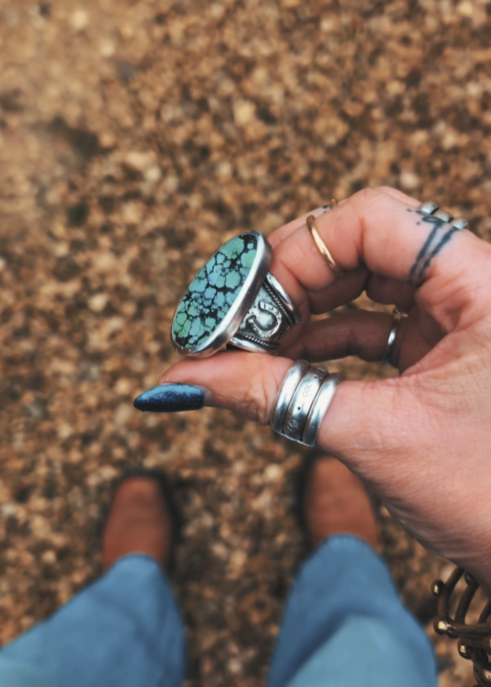 ~One badass chonk of Hubei Turquoise, wrapped in fine silver, sat on top of my signature Echo bands adorned with spiritual, Western gal detail, perfect for that everyday bohemian statement...