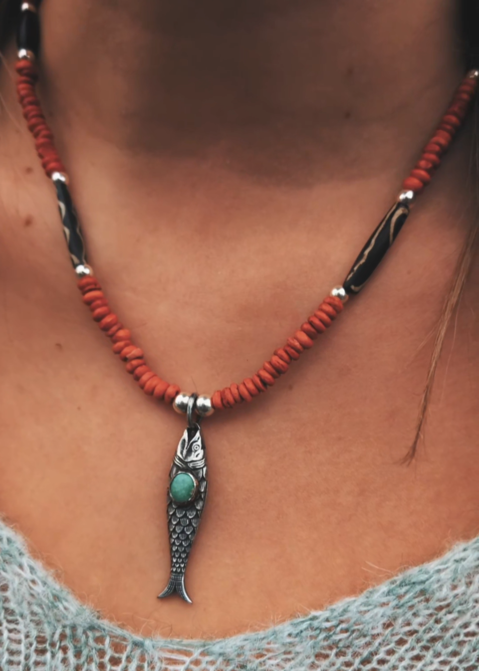 ~The absolute neck-mess must have, hand-crafted slowly with love and deep spiritual intention, this necklace features a solid sterling silver Lucky Fish, adorned with a Carico Lake Turquoise, wooden tribal beads from America, and sterling silver beads and fastening...