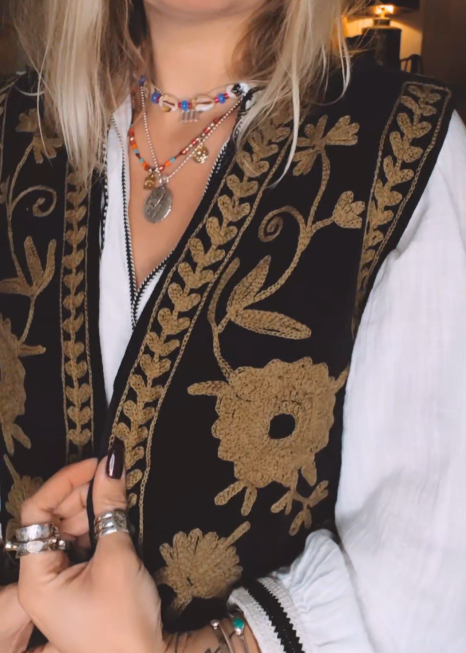 ~ Please note, each gilet is handmade so there may be ever so slight variations in the hand-embroidered pattern